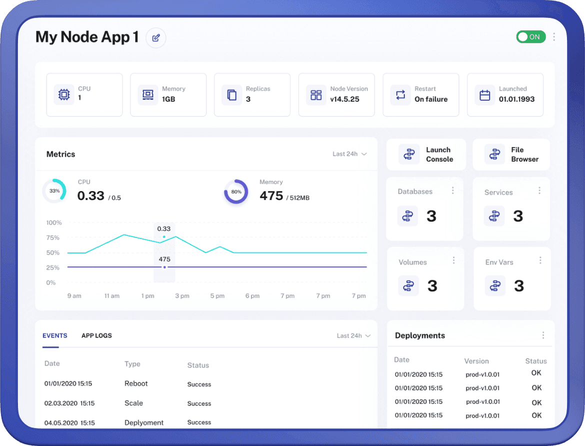 Deploy and run your NodeJS App Quickly & Effortlessly. We'll deploy your application to your own private server completely free of charge. Simple, fast, reliable and flexible - it's the ideal solution for any Node App.